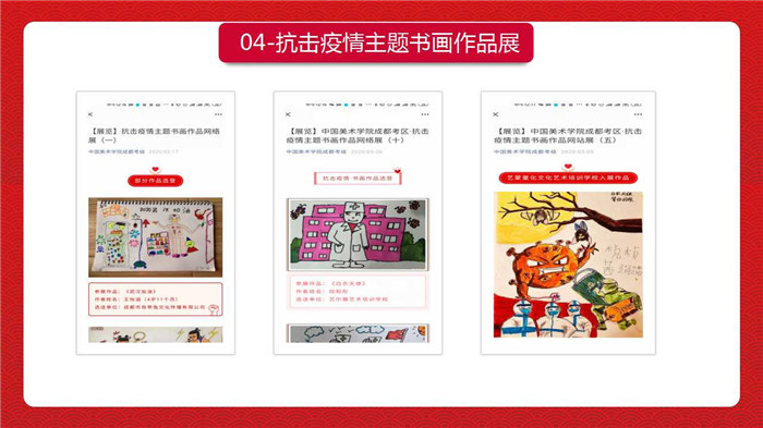 本网讯 中国美术学院考级中心成都考区2020年度工作总结暨表彰会议于2021年3月18日下午通过线上形式举行。本次会议进行了六项议程,中国美术学院考级中心成都考区执行主任徐嘉对2020年度工作进行了回顾总结,宣布今年的重点工作事项和考级计划,同时对考级流程和规范报考资料做了展示和强调。副主任郭元杰在会上对中国美术学院考级作品进行了详尽解析,并展示了各科目各级别的考级示范作品。副主任徐玮对规范考试、考场布置以及监考制度进行了详细解读和强调。最后,由成都考区主任陈晓明在会上公示表彰了2020年度先进单位、优秀组织单位、优秀指导教师获奖名单。
